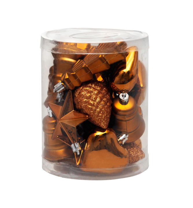 Charakteristika: Táto súprava obsahuje 20 kusov medeno zlatých ozdôb v rôznych tvaroch – zvončeky, hviezdy, srdcia či šišky, ktoré dokonale doplnia sviatočnú výzdobu. Ich elegantný metalický odtieň prinesie do vášho interiéru luxusnú a zároveň teplú atmosféru. Ozdoby sú vyrobené z kvalitného plastu, čo zaručuje ich odolnosť a bezpečné používanie. Ľahké zavesenie zabezpečia praktické očka s háčikmi, takže stromček bude vyzdobený rýchlo a jednoducho.