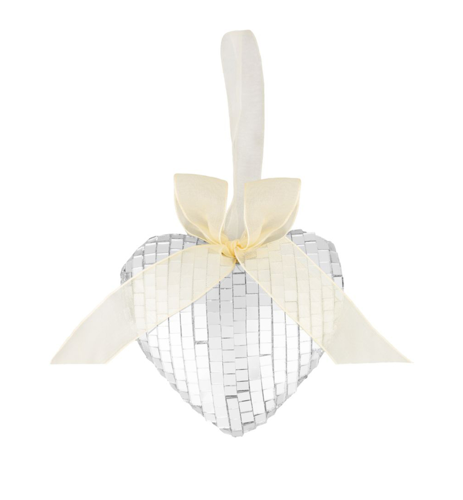 Závesná ozdoba v tvare srdca s mašľou v striebornom prevedení.