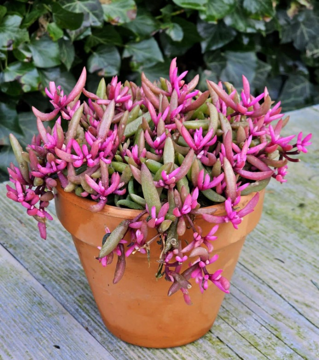 Vždyzelená sukulentná rastlina so záplavou viacfarebných kvetov.