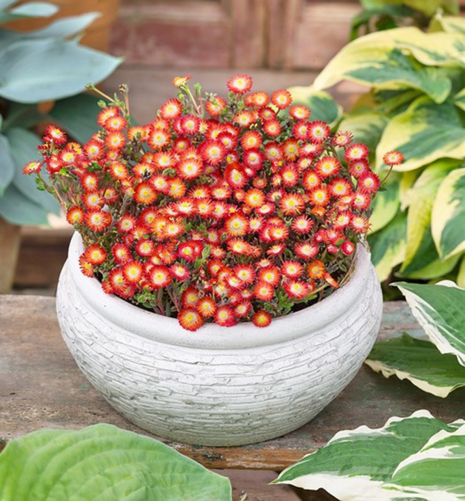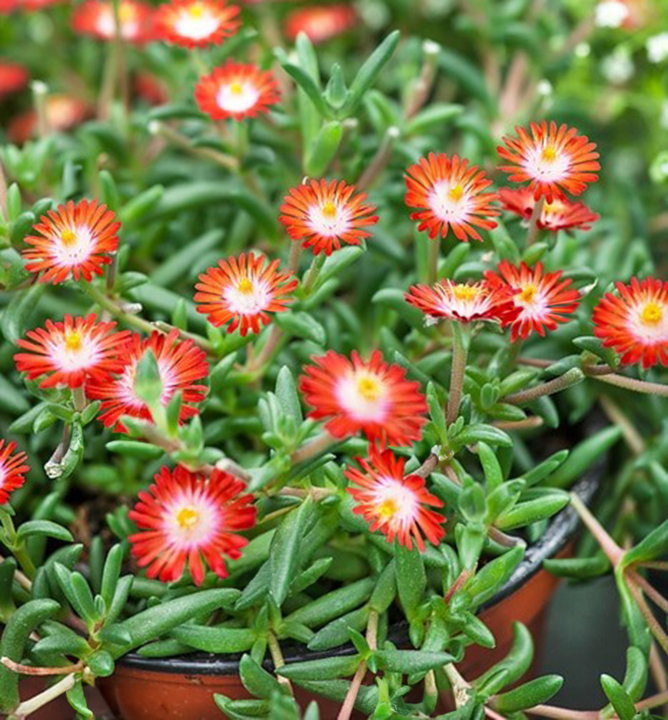Charakteristika: Delosperma ´JEWEL OF DESERT GRENADE®´ je pôdopokryvná a rýchlo rastúca skalnička, vhodná aj na pestovanie v nádobách. Kvitne od mája menšími oranžovo-červenými kvetmi s jasno žltým stredom v tvare hviezdy. Kvety sa počas dažďa a v noci zatvárajú. Listy sú dužinaté, zelenej farby, pripomínajú kaktus. Dobre odoláva teplu, suchu a je mrazuvzdorná do -23°C.