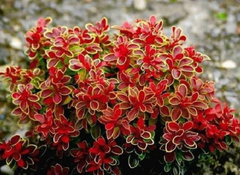 Vždyzelený kompaktný ker s dvojfarebnými listami a bielymi kvetmi.