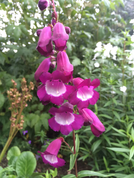 Elegantná trvalka so zvončekovými kvetmi intenzívnej ružovej farby s bielym hrdlom.