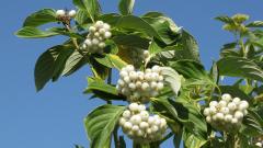 Pôsobivá kalinolistá hortenzia s bielymi guľovitými súkvetiami.