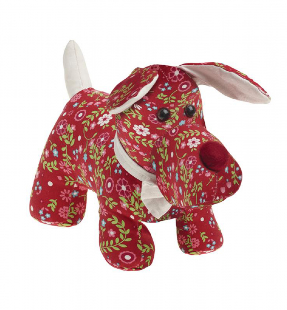 Držiak okien a dverí - červený pes je ušitý z kvetinovej látky.