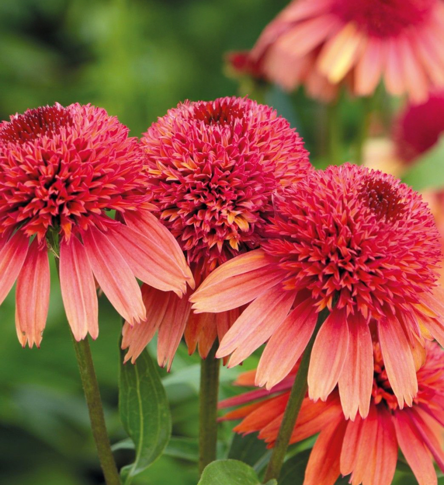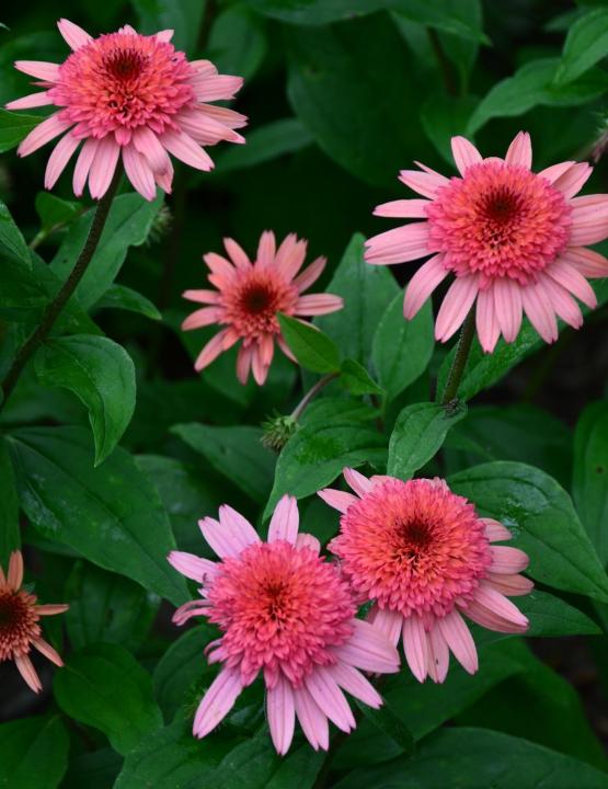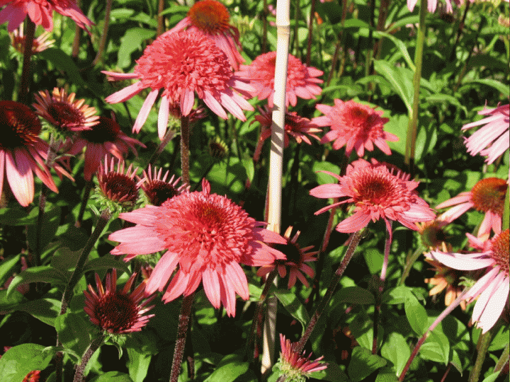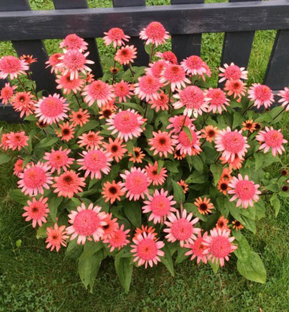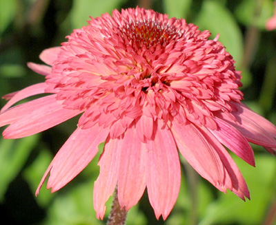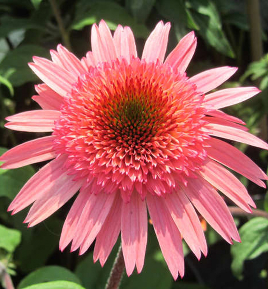 Atraktívna echinacea s veľkými plnými kvetmi lososovoružovej farby s výrazným stredom.