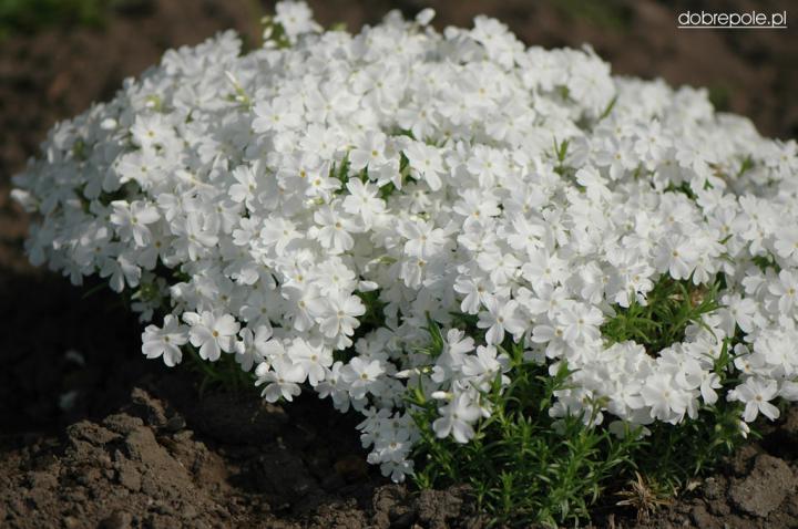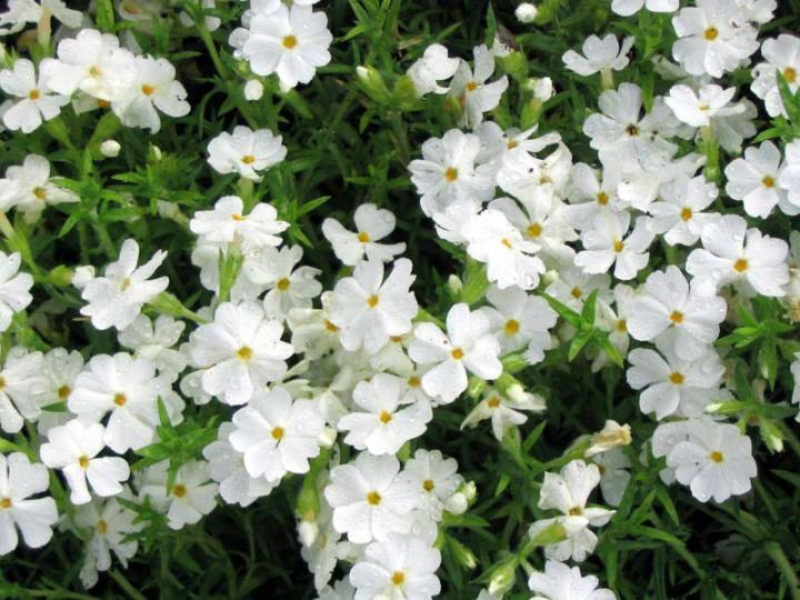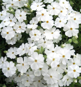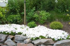 Bohato kvitnúca kobercovitá odroda s hviezdicovitými kvetmi snehobielej farby.