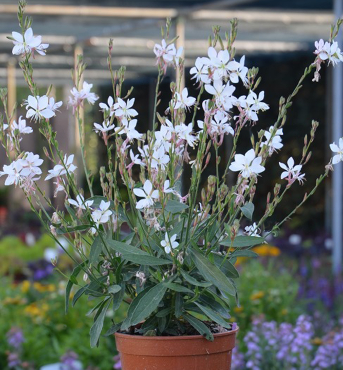 Elegantná gaura s jemnými kvetmi v tvare motýľa, vhodná aj na pestovanie v črepníku.