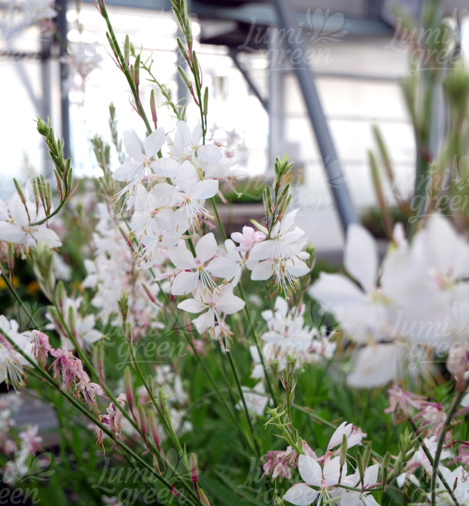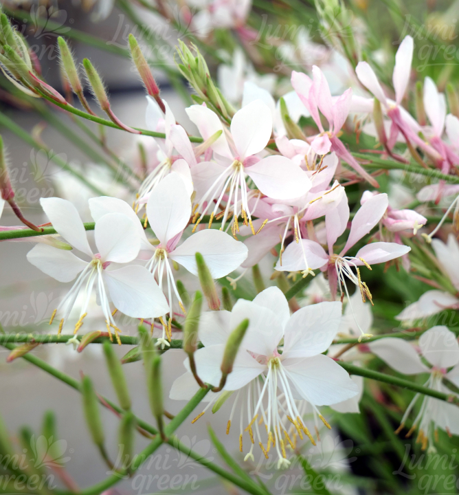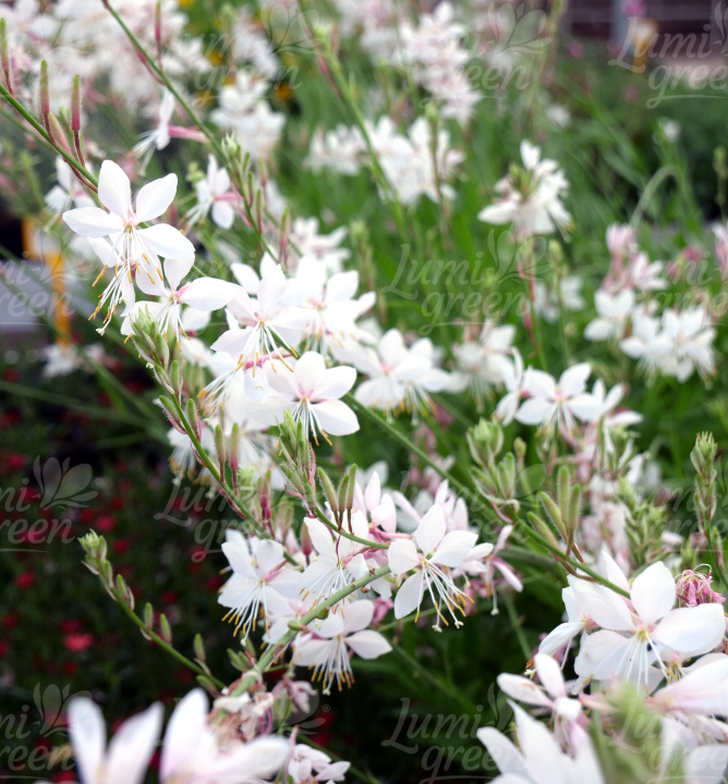Charakteristika: Gaura Lindheimerova patrí medzi bohato kvitnúce rastliny, ktoré vytvárajú počas leta na vzpriamených stonkách malé biele kvety, pripomínajúce motýlie krídla. Kvety sa rozvíjajú zo svetloružových pukov, čím vytvárajú na rastline elegantnú farebnú kombináciu. Vytvára kompaktné trsy s podlhovastými listami sviežej zelenej farby. Rastlina je vhodná na výsadbu do skaliek, na okraje chodníkov alebo do črepníkov.