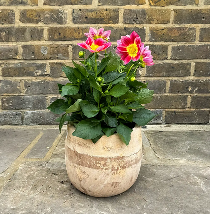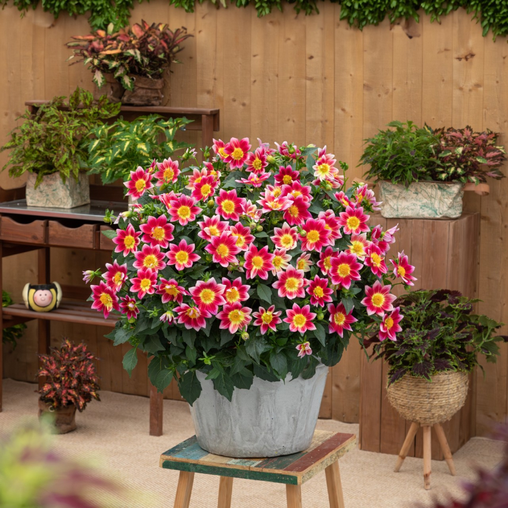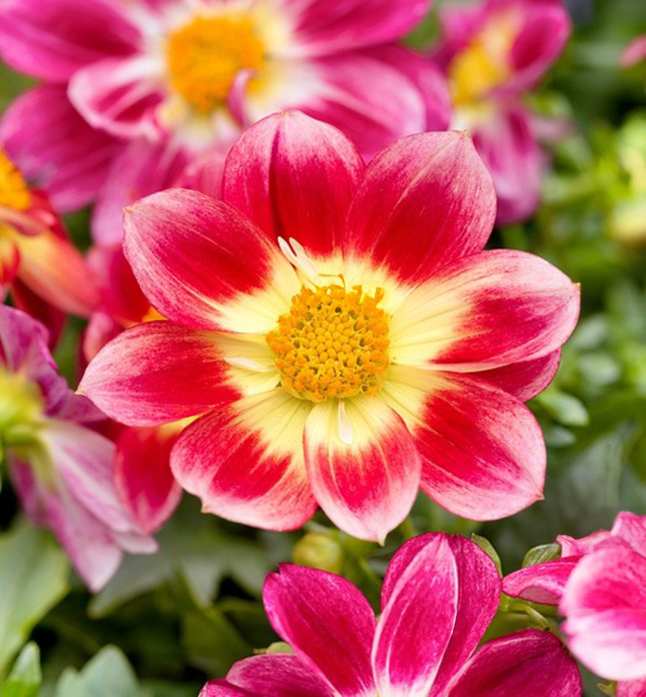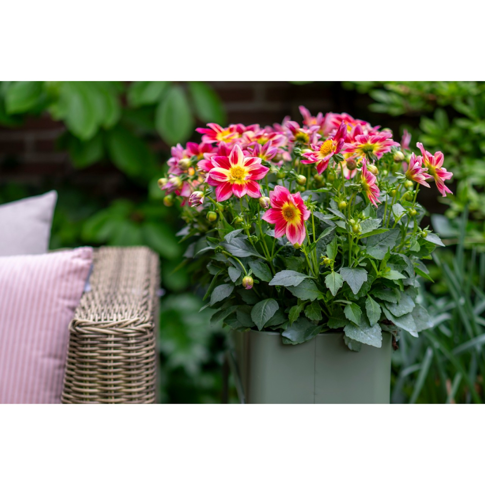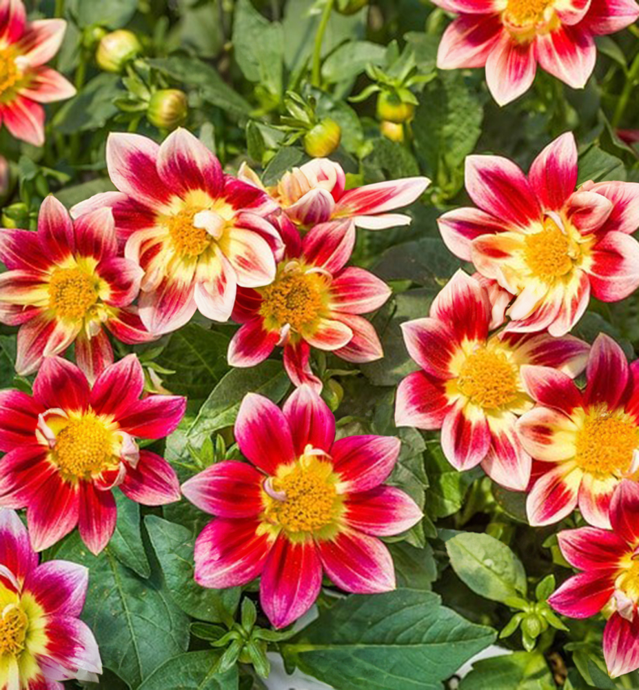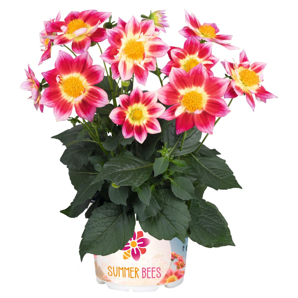 Charakteristika: Georgína ´SUMMER BREEZE RED BICOLOUR´ je kompaktná odroda, ktorá rozžiari záhradu veľkými dvojfarebnými kvetmi v žiarivej čerešňovočervenej s jemnou žltou. Kvety kvitnú od začiatku leta až do prvých mrazov a lákajú včely aj motýle. Listy sú tmavozelené, pevné, lesklé a so zúbkovaným okrajom. Rastlina dorastá do výšky 60–90 cm a je ideálna na stredné a zadné časti záhona, pričom kvety sú vhodné aj na rez.