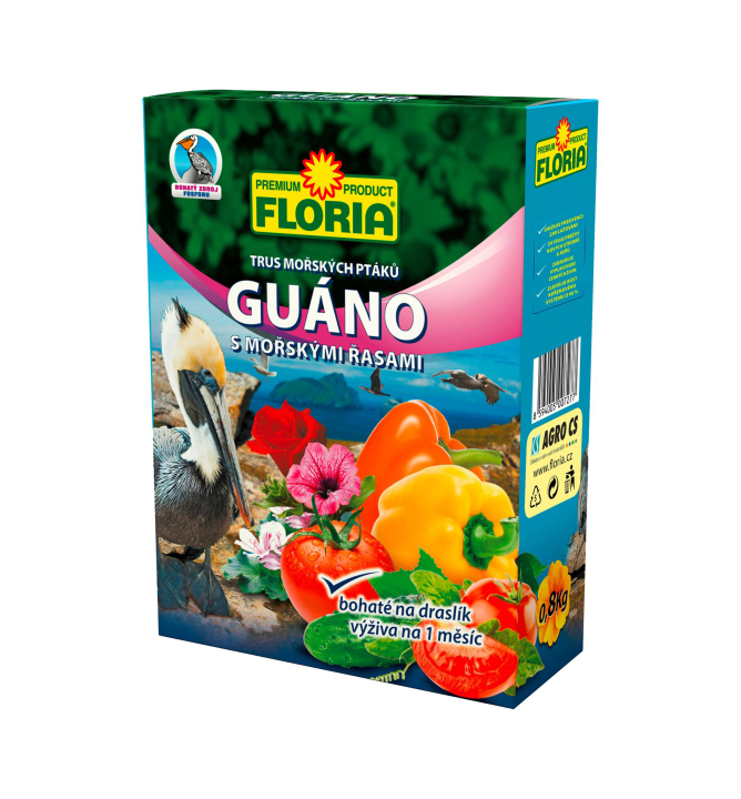 Charakteristika: FLORIA Guáno s morskými riasami je prírodné hnojivo, ktoré dodáva rastlinám potrebné živiny a aktivuje pôdne mikroorganizmy, a to počas celého vegetačného obdobia. Používa sa na základné hnojenie pred výsadbou, prípadne na prihnojovanie rastlín v priebehu vegetácie. Je ideálny na pestovanie ovocia, zeleniny, balkónových a okrasných rastlín, a ďalších rastlín a plodín a pôsobí 1 mesiac. Morské riasy v Guáne sú bohaté na železo a významne aktivujú rast rastlín. Guáno je organické hnojivo s dlhodobým uvoľňovaním živín, pomer NPK = 3,7 - 1,7 - 7