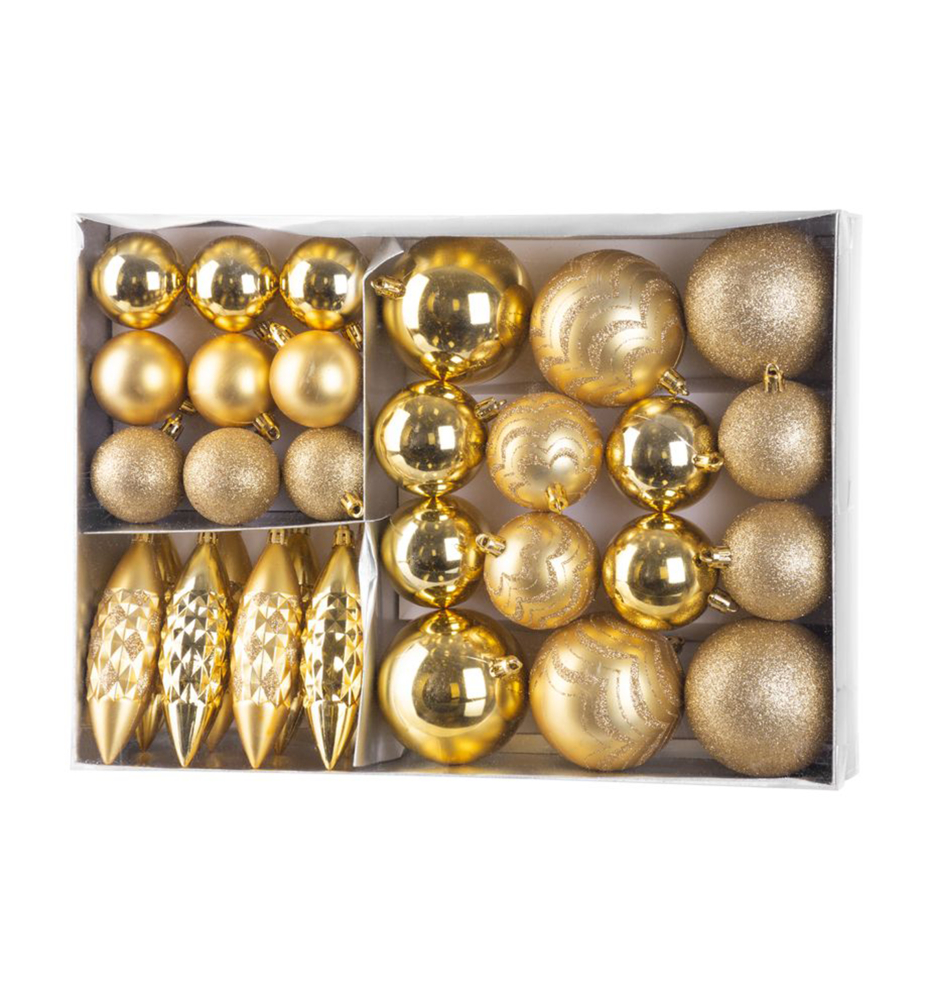 Charakteristika: Súprava ozdôb na stromček slúži na slávnostné ozdobenie vianočného stromčeka. Pozostáva z 31 ks ozdôb s rozmermi 6x8 cm - 8x6 cm a 9x5 cm - 8x12 cm. Farba ozdôb je zlatá. Sú vyrobené z plastu.