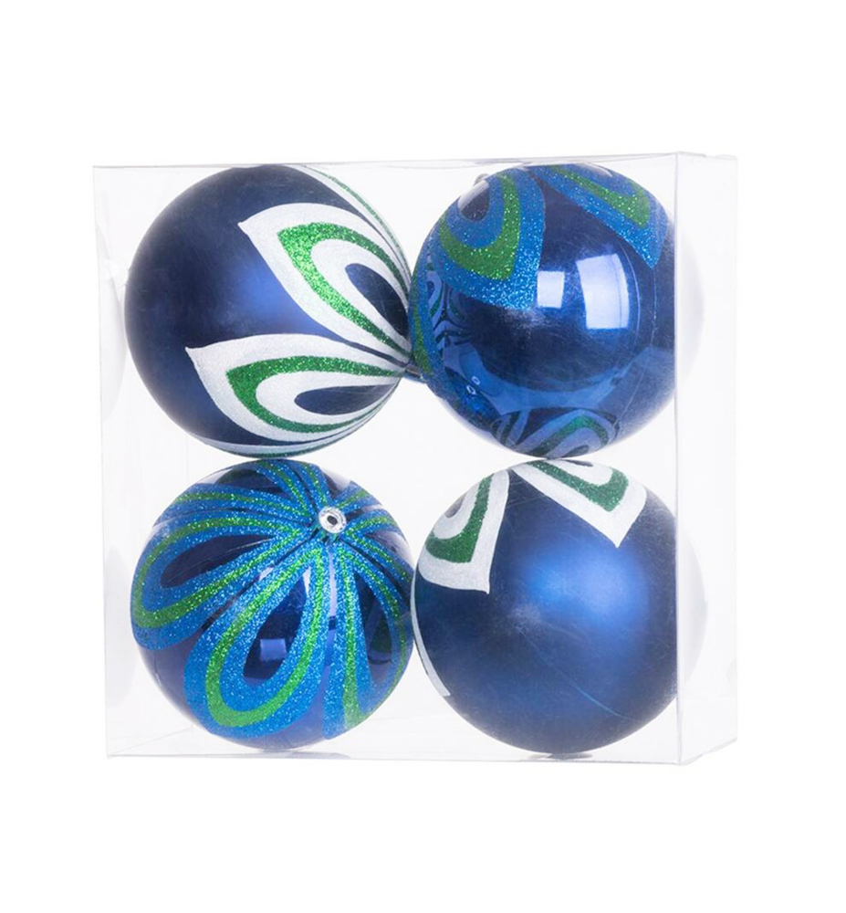 Charakteristika: Súprava ozdôb na stromček slúži na slávnostné ozdobenie vianočného stromčeka. Pozostáva zo 4 ks vianočných gúľ s priemerom 10 cm. Farba gúľ je modrá s dekoráciou. Sú vyrobené z plastu.