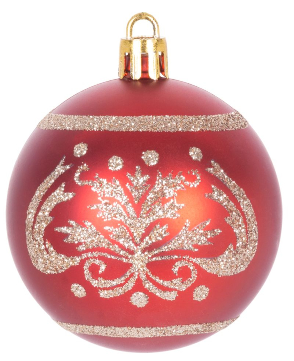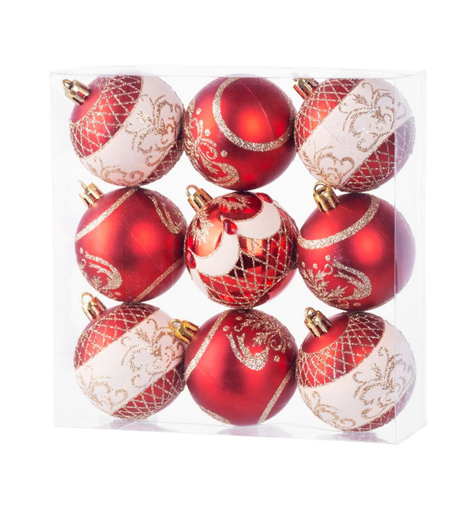 Charakteristika: Súprava ozdôb na stromček slúži na slávnostné ozdobenie vianočného stromčeka. Obsahuje 9 ks vianočných gúľ s dekoráciou a priemerom 6 cm. Farba guľ je červená. Sú vyrobnené z plastu.