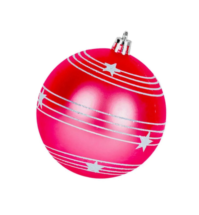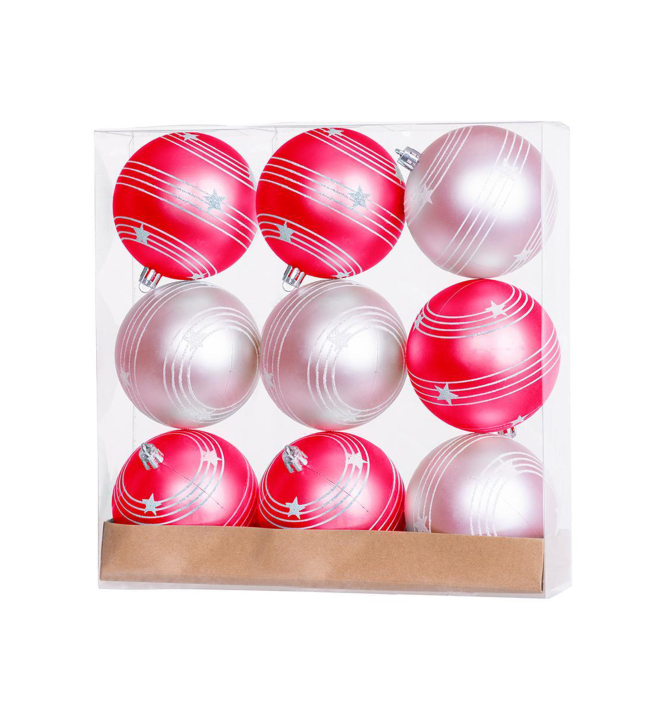 Charakteristika: Súprava ozdôb na stromček slúži na slávnostné ozdobenie vianočného stromčeka. Pozostáva zo 9 ks vianočných gúľ s priemerom 6 cm. Farba gúľ je červeno - ružová matná s dekoráciou. Sú vyrobené z plastu.