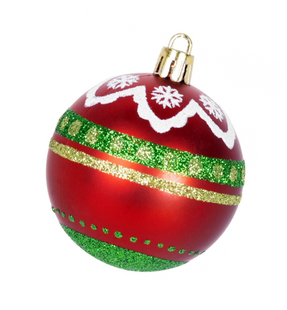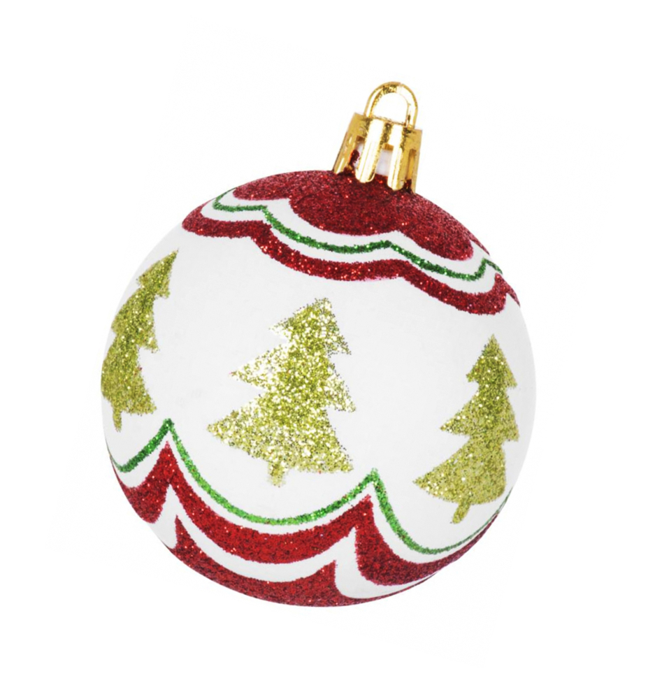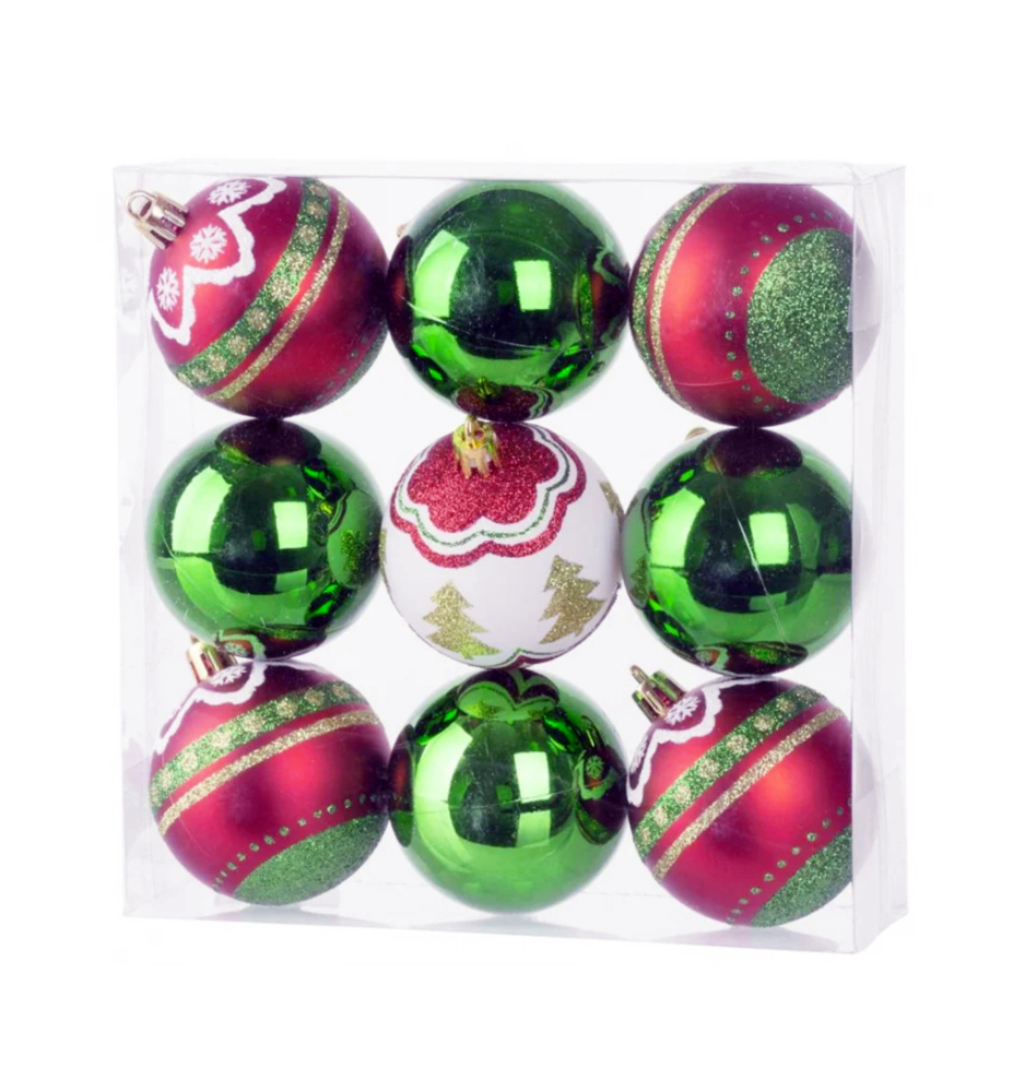 Charakteristika: Súprava ozdôb na stromček slúži na slávnostné ozdobenie vianočného stromčeka. Obsahuje 9 ks vianočných gúľ s dekoráciou a priemerom 6 cm. Farba guľ je červeno - zelená. Sú vyrobnené z plastu.