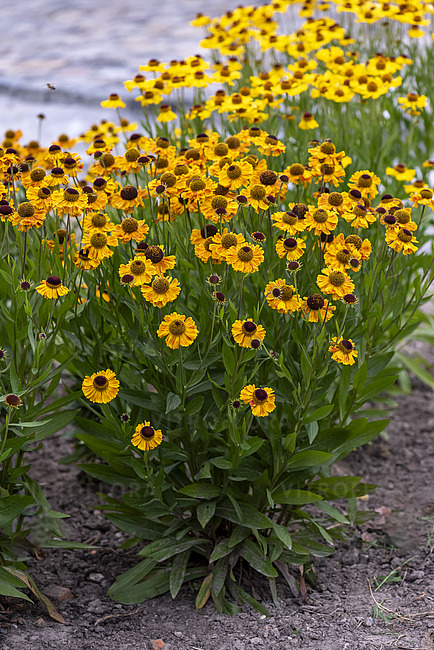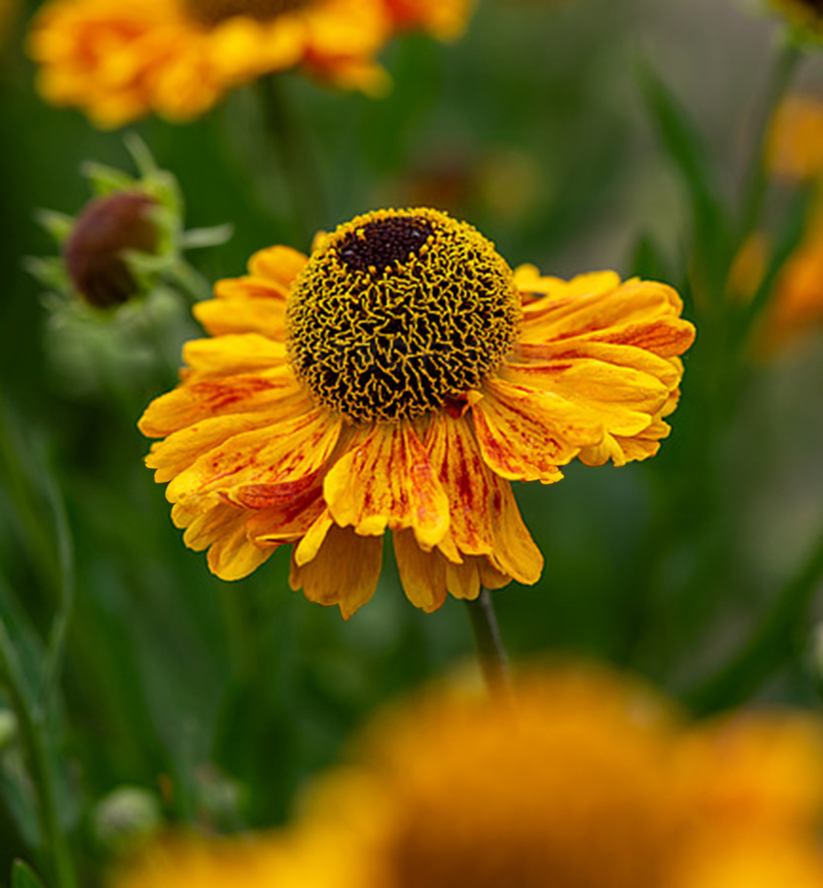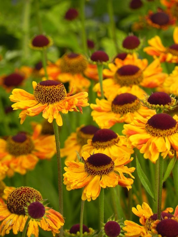 Obľúbená jesenná trvalka tvoriaca trsy s množstvom žltých kvetov s oranžovým melírovaní.