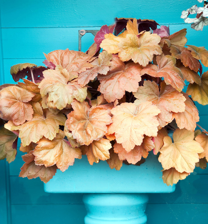 Úžasná heucherela "Sladký čaj" so škoricovočervenými listami rozžiari každé tmavé miesto.