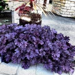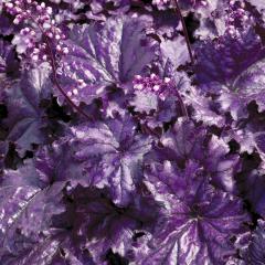 Obľúbená heuchera s lesklými listami vínovočervenej farby a striebornou kresbou.
