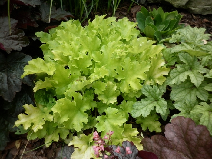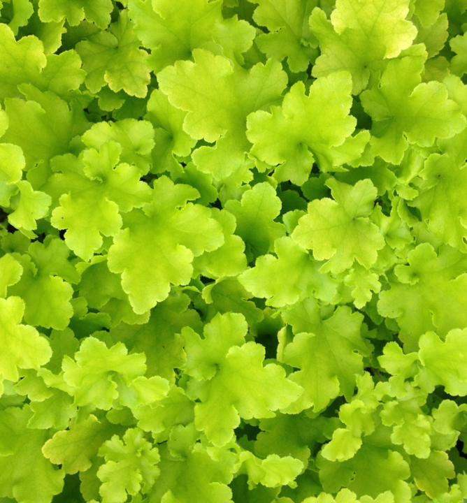 Neprehliadnuteľná heuchera so žiarivými limetkovozelenými listami.