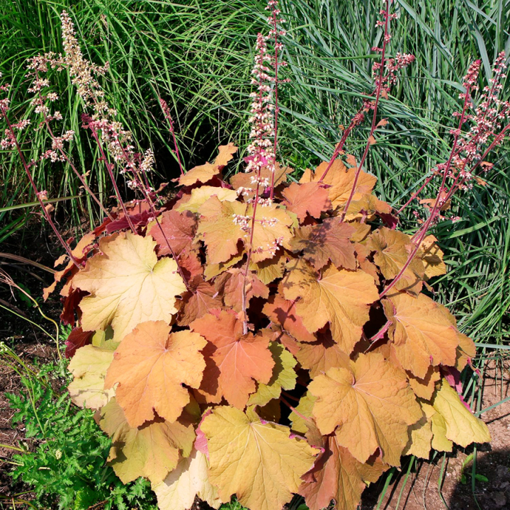 Charakteristika: Heucheru ´MEGA CARAMEL´ v záhone určite neprehliadnete. Ponúka pohľad na "mega" veľké listy nesúce žlté, oranžové, červené i karamelovohnedé odtiene. Kompaktný, skôr mierne rozložitý trs dosahuje výšku okolo 50-60 cm a o niečo väčšiu šírku. V letnom období sa nad ním vznášajú vzdušné súkvetia tvorené drobnými bielymi kvetmi. V spoločnosti s okrasnými trávami a kvitnúcimi trvalkami prinesie do záhonov hravú kompozíciu.