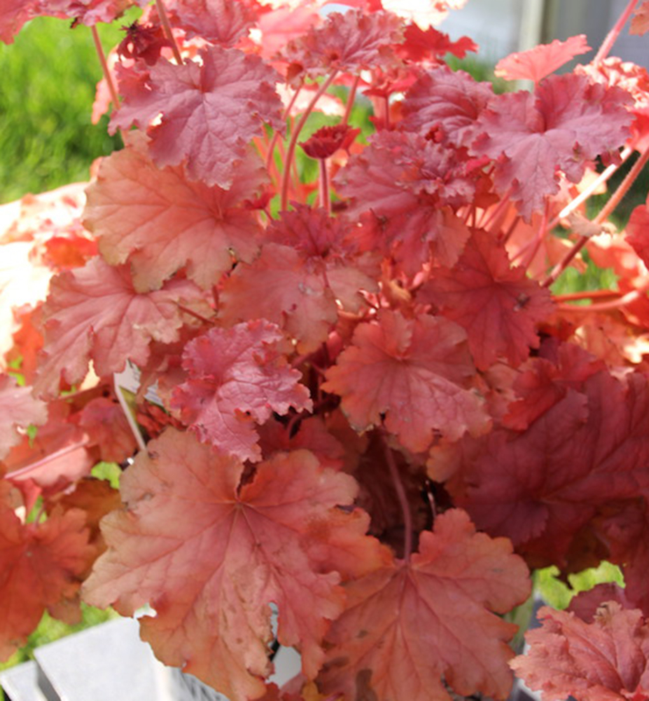 Charakteristika: Kultivar ´PEACHBERRY ICE´ očarí hlboko vykrojenými a na okrajoch zvlnenými koralovočervenými listami. Od júna do augusta kvitne zvončekovitými bielymi kvetmi, ktoré vyrastajú na vzpriamených stonkách týčiacimi sa nad listami. Dorastá do výšky 30-40 cm a vytvára hustý bohatý trs. Výborne sa kombinuje s ostatnými farebnolistými kultivarmi, s ktorými vytvára pestrú mozaiku. Darí sa jej aj v črepníkoch na balkónoch a terasách. V záhradách sa s obľubou vysádza najmä pre krásne farebné listy, ktoré sú mimoriadne dekoratívne a v našich podmienkach na väčšine druhov pretrvávajú aj počas zimy.
