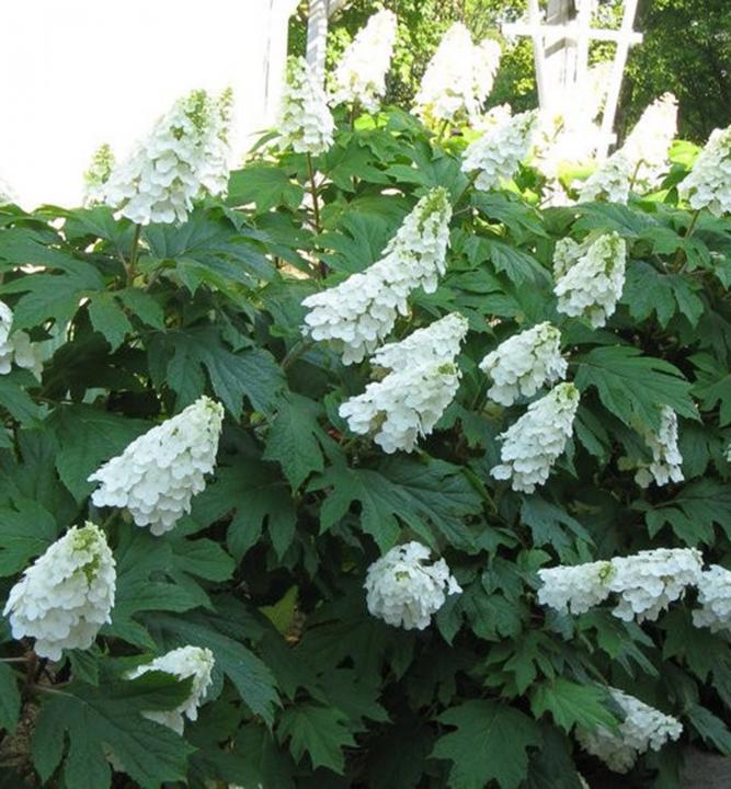 Unikátna snehovo biela hortenzia s vykrajovanými listami, ktoré na jeseň menia farbu.