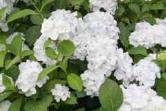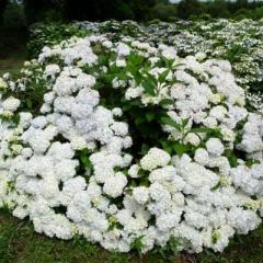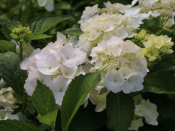 Pôsobivá kalinolistá hortenzia s bielymi guľovitými súkvetiami.