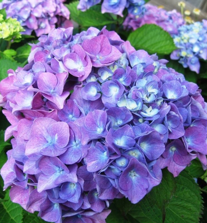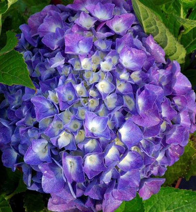 Očarujúca hortenzia s nápadnými veľkými kvetmi modrej až fialovej farby s bielym stredom.