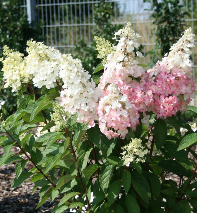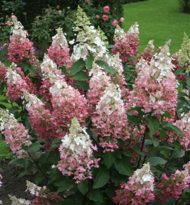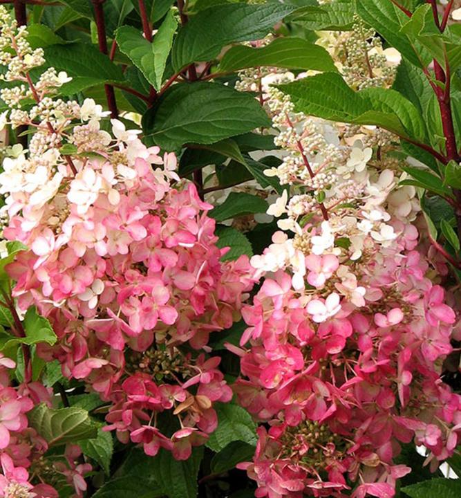 Hortenzia s krémovobielmi súkvetiami meniacimi sa na svetloružové diamanty.