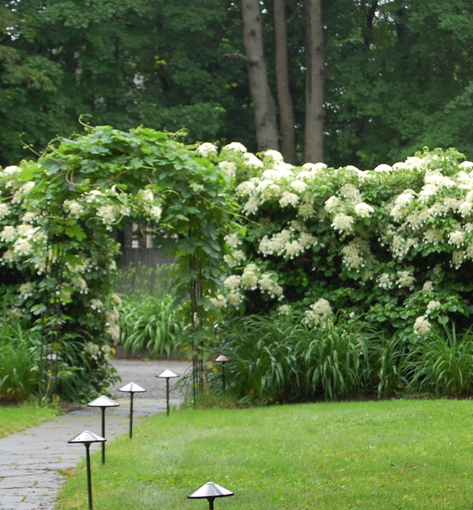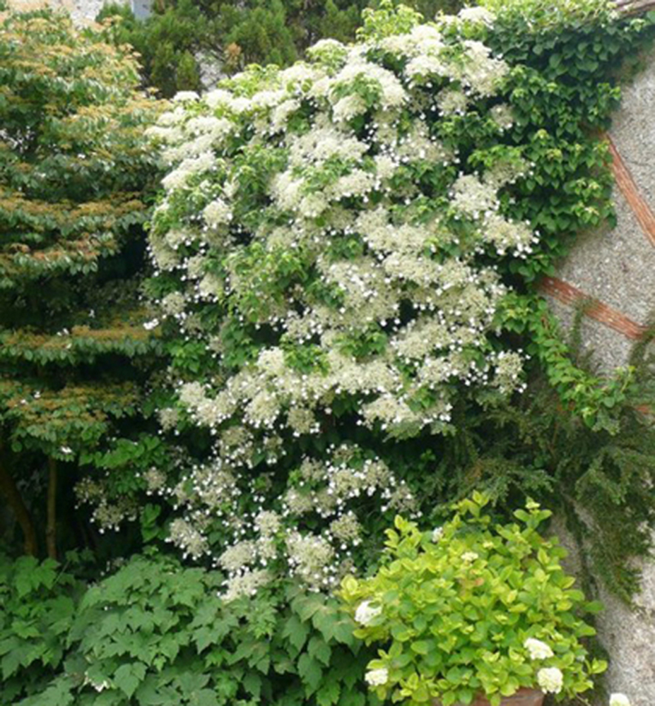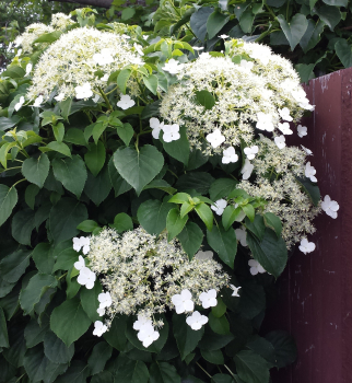 Nádherná popínavá hortenzia s netradičnými dvojfarebnými listami a bielymi kvetmi.