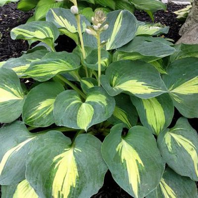 Stredne vysoká hosta s veľkými modrozelenými listami a nápadnou krémovou kresbou.
