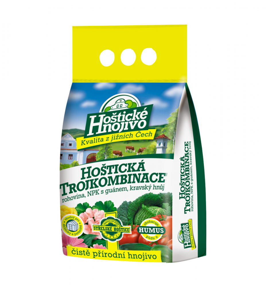 Charakteristika: Hoštická trojkombinácia je unikátna zmes prírodných organických zložiek - mletej rohoviny, prírodného NPK s guánom a granulovaného kravského hnoja. Je určená hlavne na základné vyhnojenie pôdy v skleníkoch, pareniskách a na záhonoch. Zvyšuje podiel humusu v pôde a doplňuje do nej chýbajúce základné živiny a stopové prvky. Pretože ide o čisto prírodné organické zložky, hodí sa Hoštická trojkombinácia zvlášť na pestovanie zeleniny a ovocia.