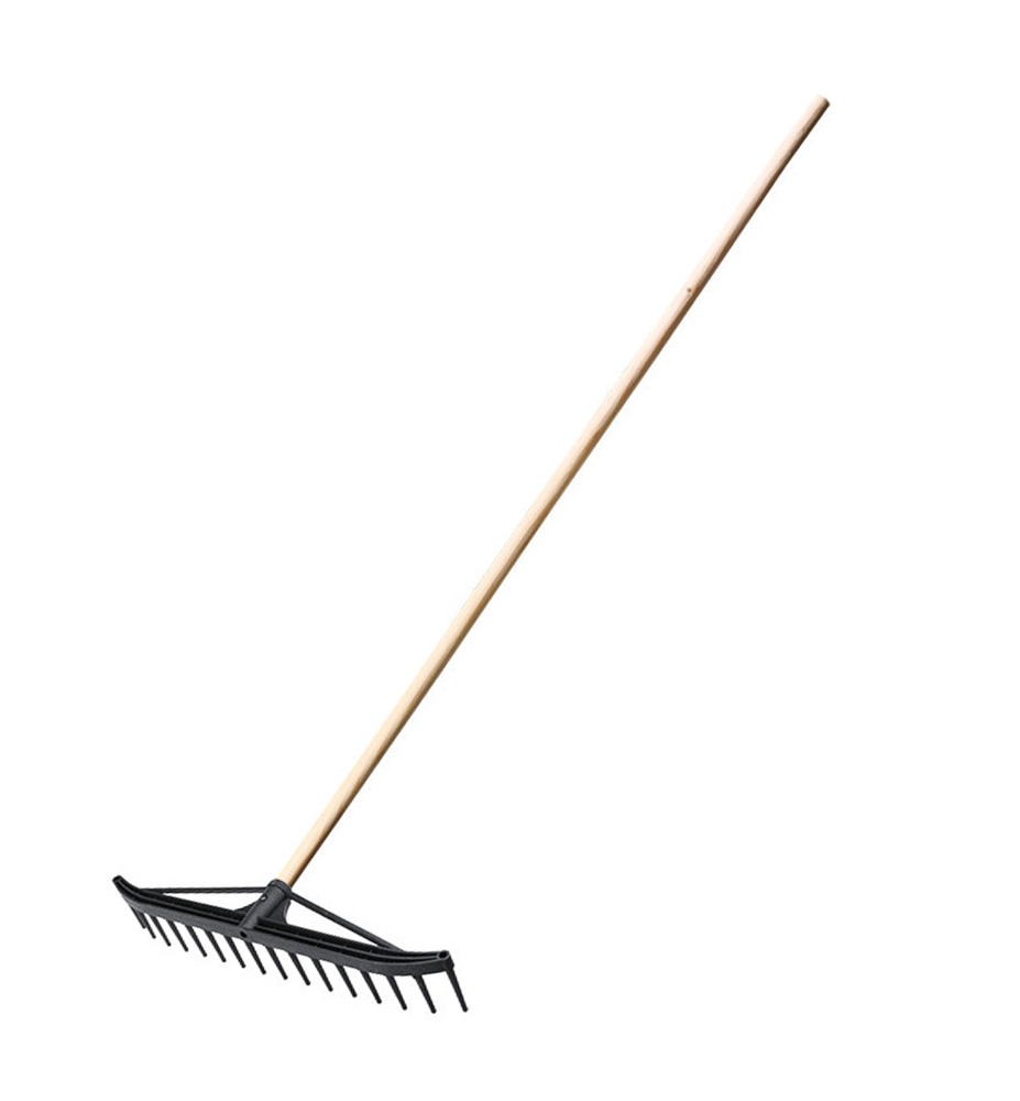 Plastové hrable so 16 zubami s drevenou násadou určené na údržbu záhrady.