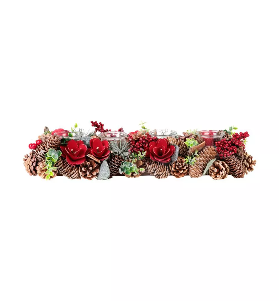 Charakteristika: Ikebana MagicHome by nemala chýbať vo výbave vášho interiéru počas vianočných sviatkov. Je to prírodná, adventná ikebana so šiškami a červenými kvetmi. Rozmery sú 50x16x9 cm.