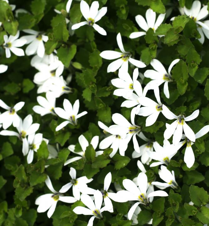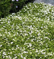 Dlho kvitnúca trvalka s bielymi kvetmi s fialovou žilnatinou a pôdopokryvným vzrastom.