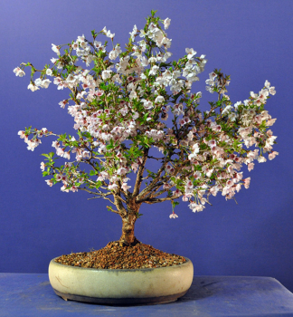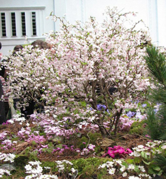 Nádherná previsnutá okrasná jabloň so záplavou ružových až purpurových kvetov.