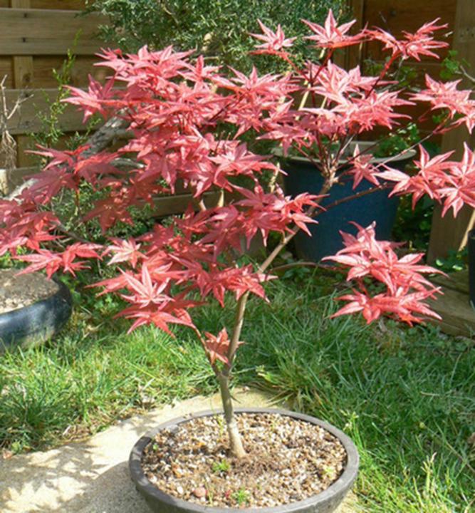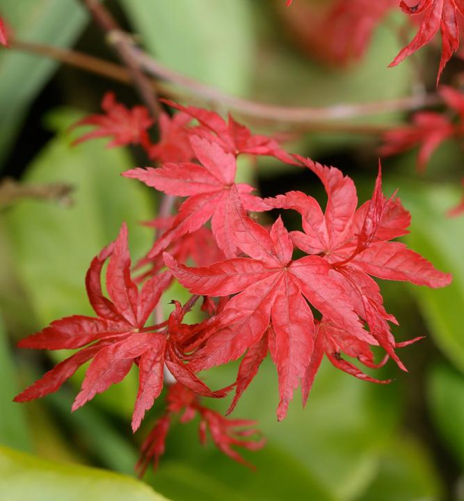 Vyhľadávaný trpasličí javor s menšími gaštanovočervenými listami.