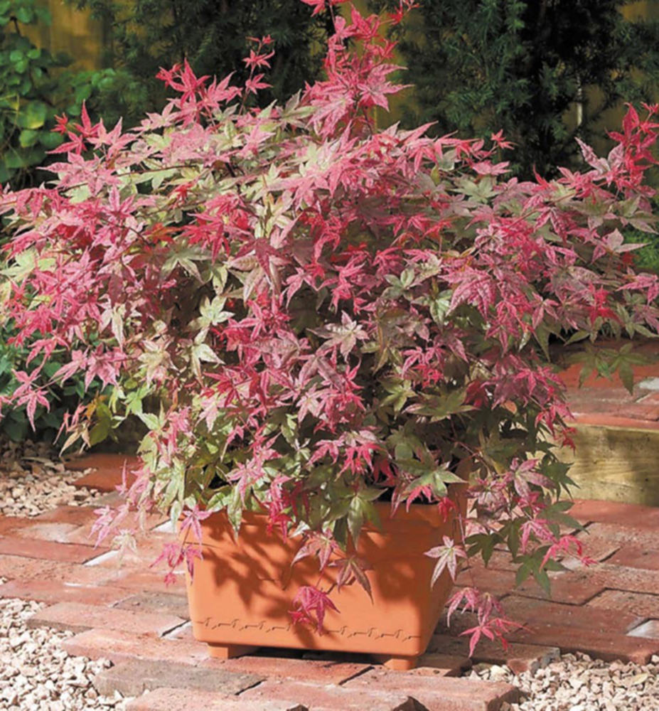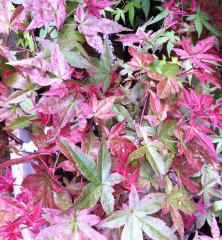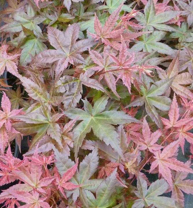 Pomaly rastúci japonský javor s oranžovo-zeleno-žltými listami.