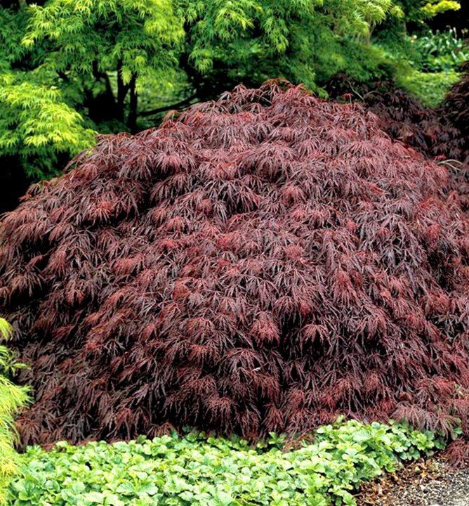 Vyhľadávaný trpasličí javor s menšími gaštanovočervenými listami.