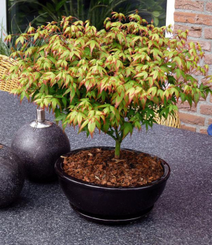 Vyhľadávaný trpasličí javor s menšími gaštanovočervenými listami.