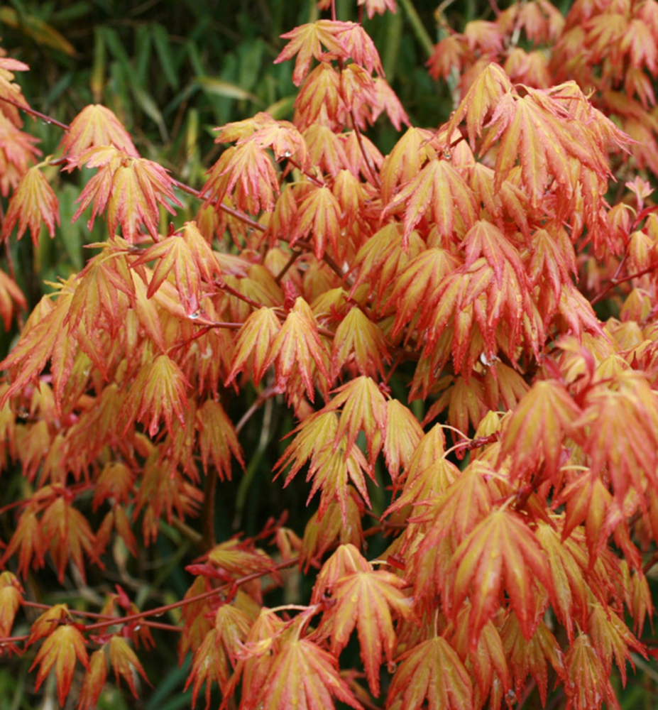 Pomaly rastúci japonský javor s oranžovo-zeleno-žltými listami.