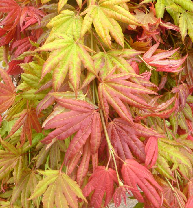 Pomaly rastúci japonský javor s oranžovo-zeleno-žltými listami.