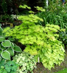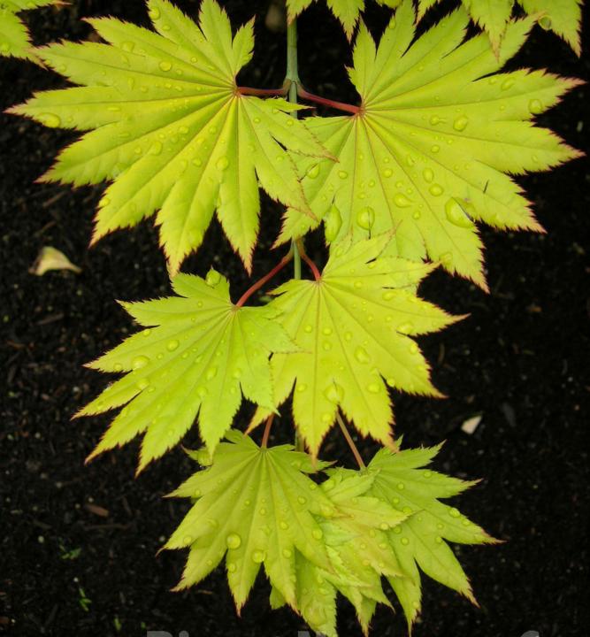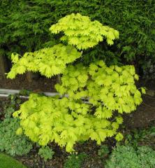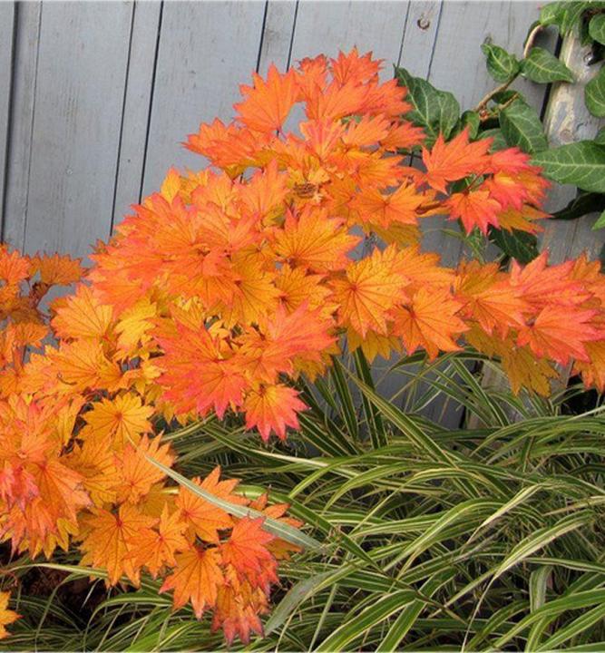 Pomaly rastúci japonský javor s oranžovo-zeleno-žltými listami.