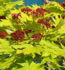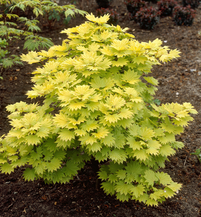 Vyhľadávaný trpasličí javor s menšími gaštanovočervenými listami.