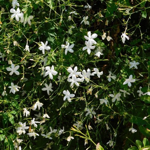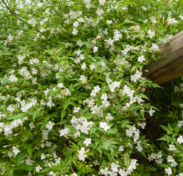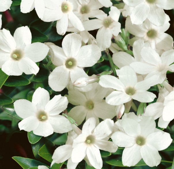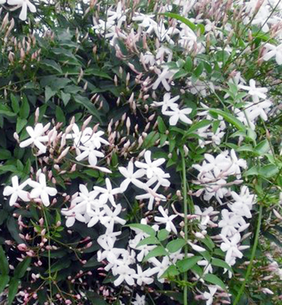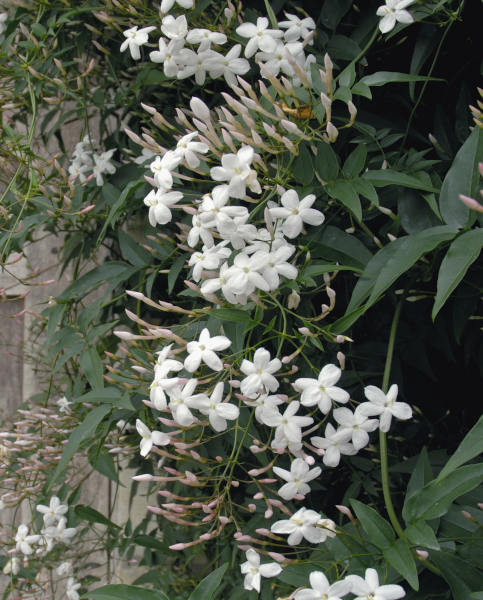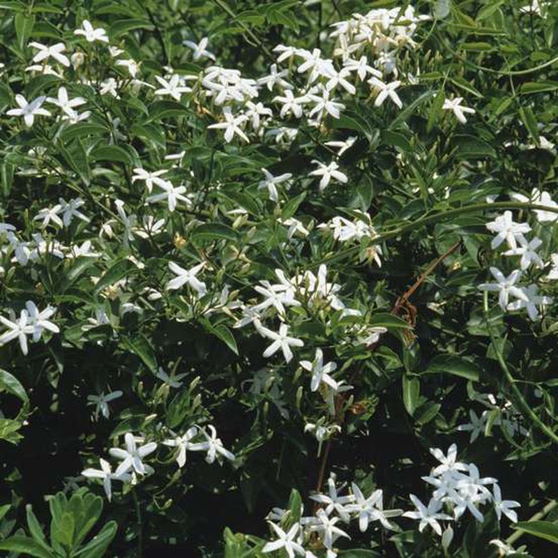 Charakteristika: Jazmín je popínavý opadavý ker s úzkymi, tmavozelenými listami. Vyniká bielymi kvetmi v tvare hviezdy, ktoré rastú v bohatých zhlukoch. Kvety majú typickú jemnú vôňu jazmínu. Rastie do výšky 4 - 5 m, jeho výšku môžeme upravovať rezom. Odrodu je mimoradne vhodné vysádzať na pergoly, oporné múry a ploty. Jazmín lekársky má množstvo liečivých účinkov, používa sa napríklad na výrobu jazmínového oleja.