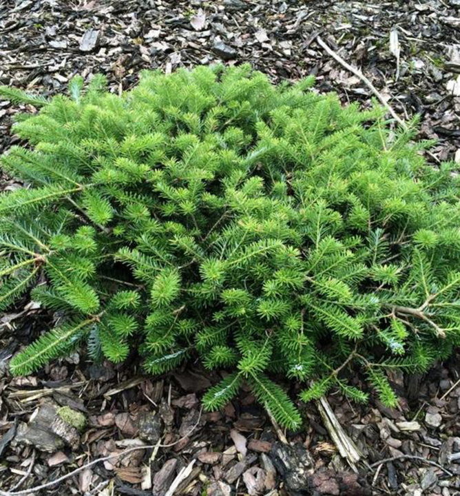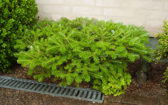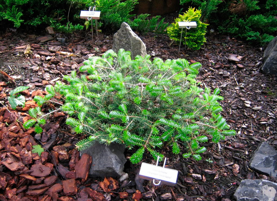 Zakrslý ihličnan s rozložitým vzrastom a svetlozeleným ihličím.