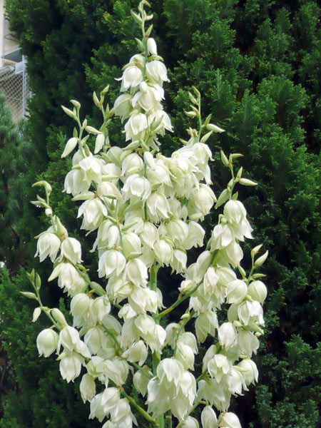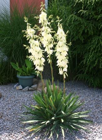 Bohato kvitnúca ľaliovka s veľkými, krémovo bielymi kvetmi so žltým hrdlom.
