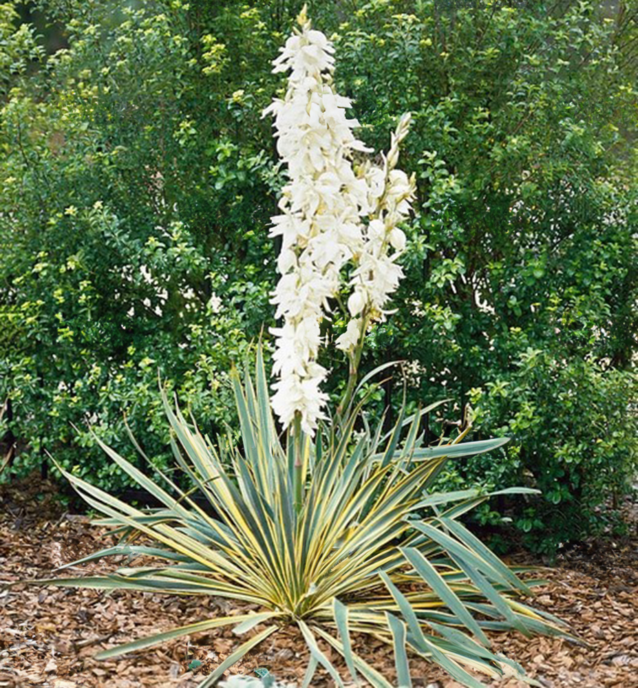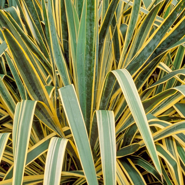 Ozdobná juka so sivozelenými listami a výraznými žltými okrajmi.