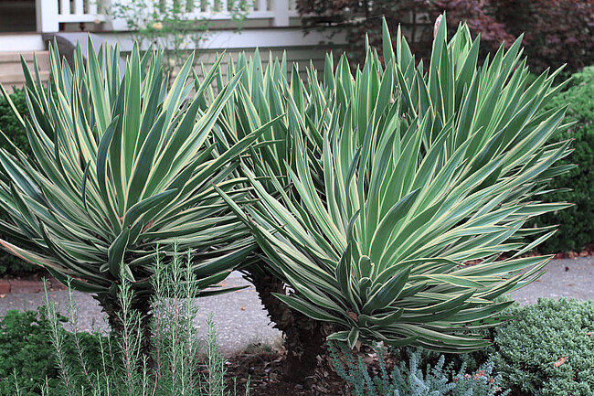 Exoticky pôsobiaca juka s tmavozelenými listami a slonovinovobielym okrajom.