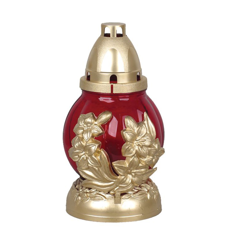 Charakteristika: Kahanec so zlatými akcentmi je vyrobený z kvalitného červeného skla ozdobeného zlatým kvetinovým reliéfom. Je ideálnou voľbou pre každého, kto hľadá estetické a dôstojné riešenie na vyjadrenie spomienky a úcty. Vďaka kompaktným rozmerom je vhodný aj na menšie náhrobky či urnové miesta. Kahanec obsahuje náplň s dobou horenia 18 hod.